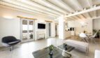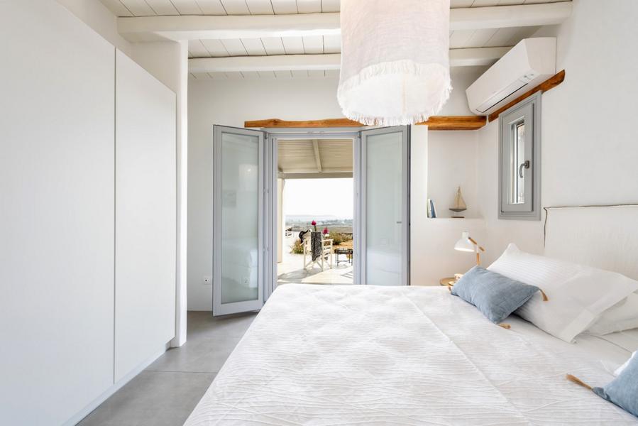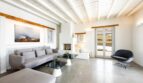 Villa Althaia welcomes guests into its stylish, open-plan interior, where contemporary design meets serene coastal living. The villa is adorned with a minimalist design, featuring chic cement surfaces, grey tones, and warm wooden ceilings. The spacious living room offers a white-washed atmosphere with modern furniture, making it the ideal space to relax after a day of exploring the beautiful island.